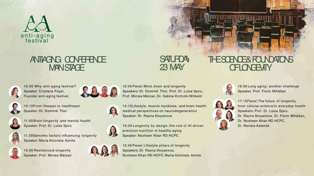 Festivalul Anti-Aging 2026 devine astfel un reper în domeniul bunăstării, un loc în care știința, inovația și inspirația se întâlnesc pentru a contura un viitor mai conștient.