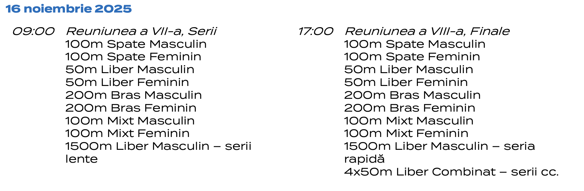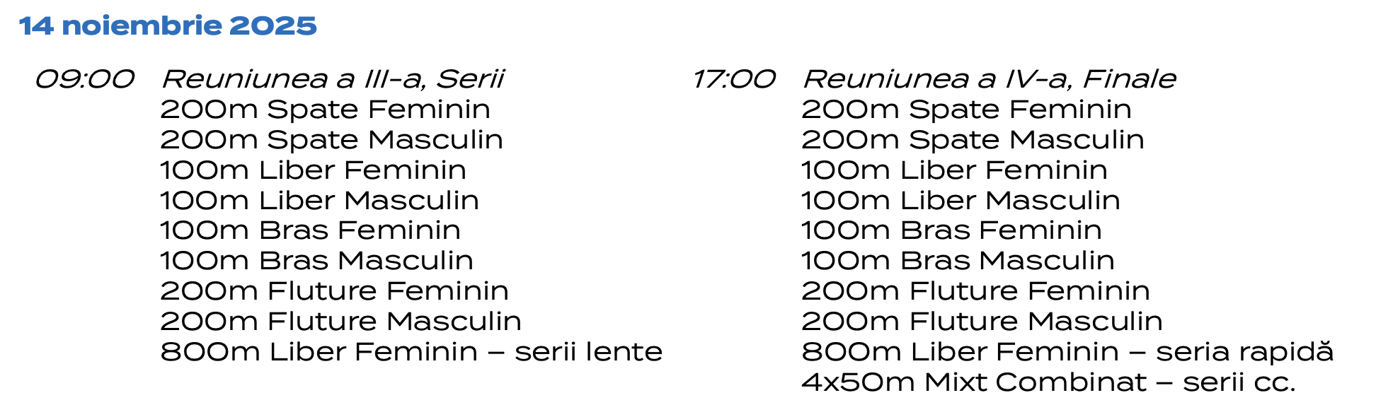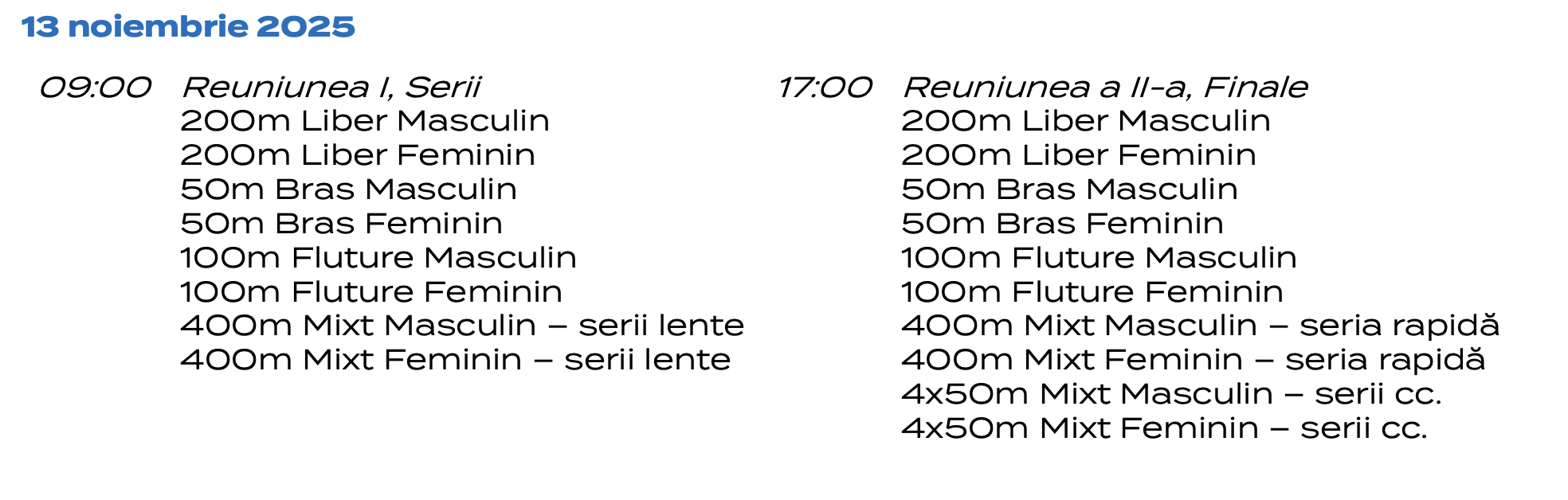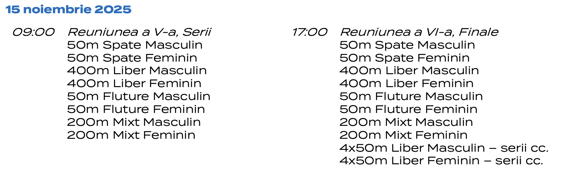 Ștafete: 4x50m Liber, 4x50m Mixt.